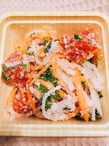 おすすめサラダ②『おからと甘夏のサラダ』 【材料】一応の目安です。適当に作っても大丈夫♪♪ 大根 8㎝ぐらい 人参 1本 塩 適量 甘夏 1個 おから 適量 ドライマンゴ― 適量 レーズン 適量 水前寺菜(大葉) 適量 【作り方】 ①大根・人参を千切りし、ボールに…