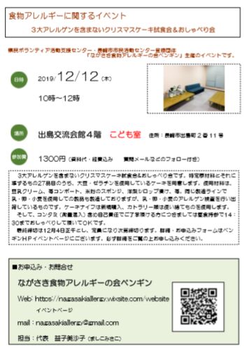 ながさき食物アレルギーの会ペンギンイベント 「12月12日㈭3大アレルゲンを含まないクリスマスケーキ試食会&おしゃべり会」 チラシ完成♪♪ 2019/12/12(木)10時~12時 出島交流会館4階 こども室 住所:長崎市出島町2番11号 参加費:1300円(資料代・経費込み…