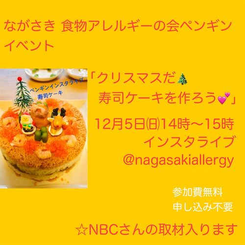 『12/5㈰14時~「クリスマスだ!寿司ケーキを作ろう!!」 ながさき食物アレルギーの会ペンギンイベント』 12月の当会イベントのお知らせです。『クリスマスだ!寿司ケーキを作ろう!!』 12月5日㈰14時~15時Instagram @nagasakiallergy参加費無料 申込不要…