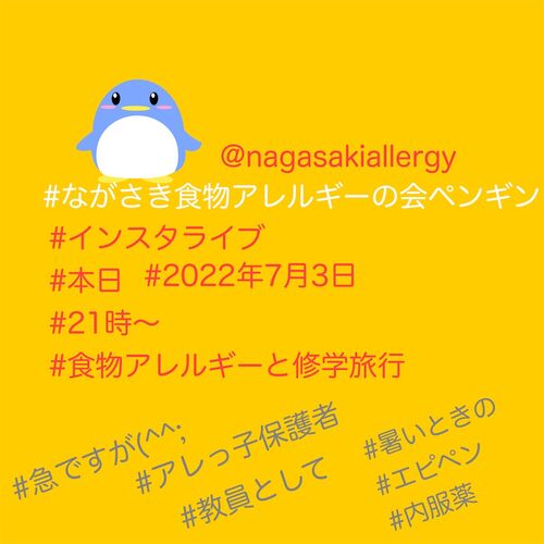 『 #食物アレルギーと修学旅行 #インスタライブ #アレっ子保護者 #教員として 』 皆さま、こんにちは。 今日も暑い長崎です。 台風が来そうですね、備えましょう!! 急ですが、 #ペンギンイベント のお知らせです。 本日 7月3日(日)21時~ #ペンギンインス…